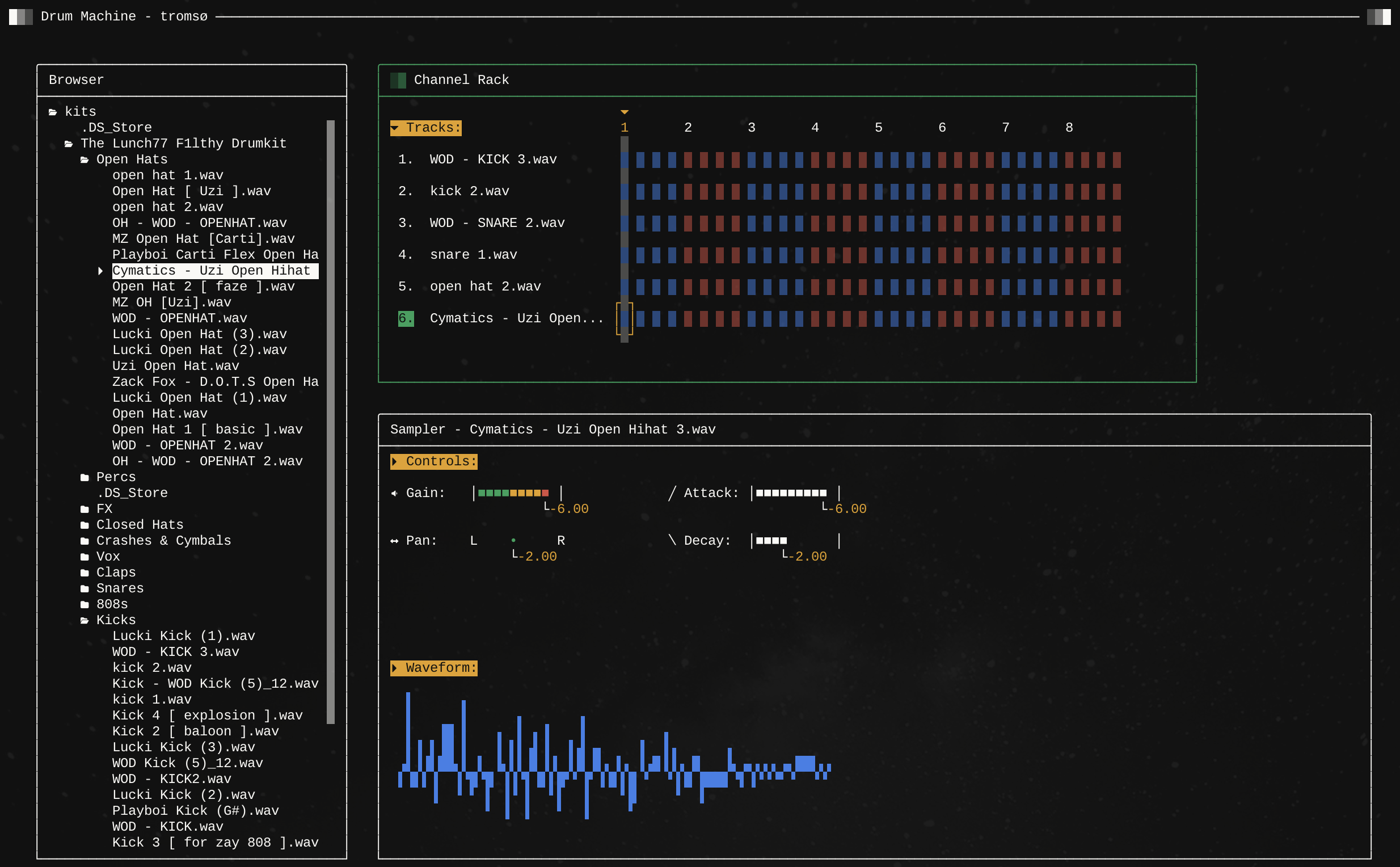 After building Trundle, we wanted to push the limits of what you can do in a command prompt. We thought recreating the FL Studio drum machine using Trundle would be a fun experiment in user experience with the goal being making a TUI for drum programming that is faster than using FL Studio's with a mouse. The experiment ultimately failed, but building a drum machine was fun for the whole team and a great way to spend January.